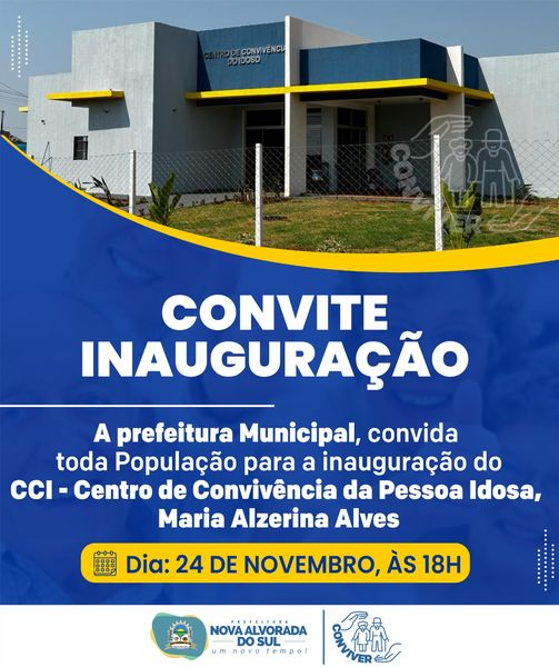 A Prefeitura Municipal tem a alegria de convidar toda a população para a Inauguração do CCI – Centro de Convivência da Pessoa Idosa, Maria Alzerina Alves.
