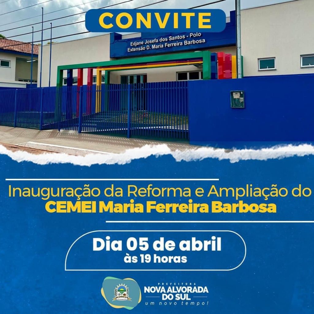 A Prefeitura Municipal tem a alegria de convidar toda a população para a Inauguração da Reforma e Ampliação do Cemei Extensão Maria Ferreira Barbosa