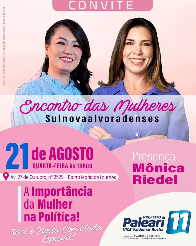 Está chegando o nosso grande evento das mulheres Sulnovaalvoradenses, com a presença da nossa primeira dama do Estado Mônica Riedel.