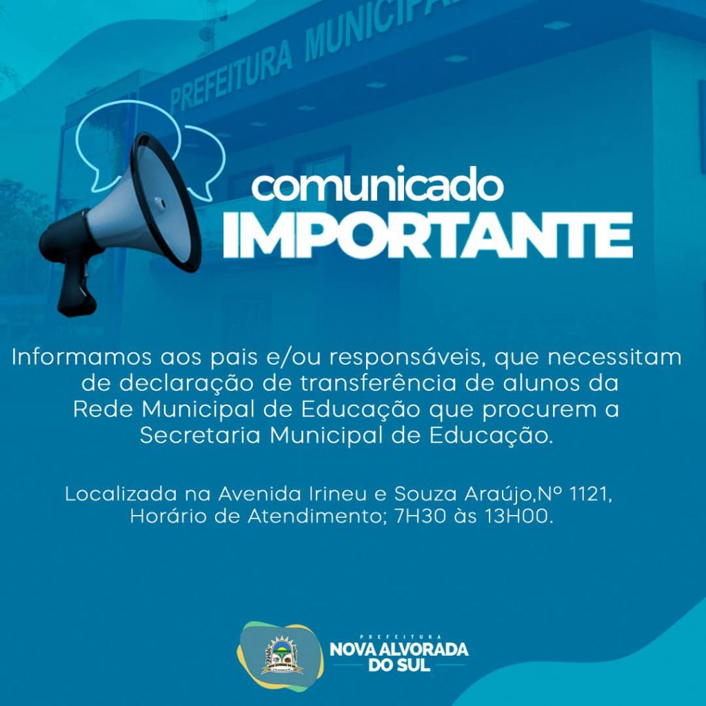A Prefeitura municipal informa aos pais e responsáveis que precisam de declarações de transferência de alunos da Rede Municipal de Educação, compareçam na Secretaria Municipal de Educação.