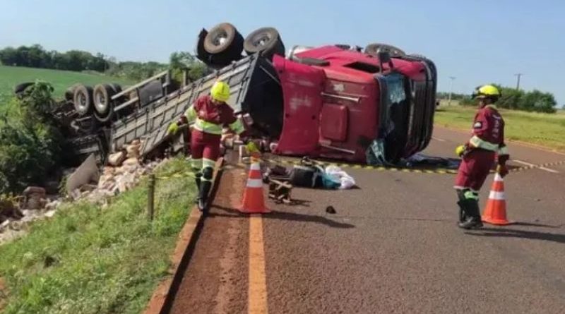 Carreta com alimentos tomba em rodovia em Rio Brilhante e interdita pista