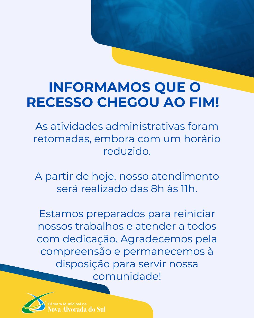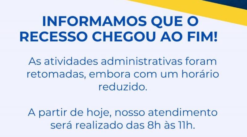 Informamos que o recesso da Câmara Municipal chegou ao fim! As atividades administrativas estão de volta, porém, com horário reduzido. A partir de hoje, nosso atendimento será das 8h às 11h.