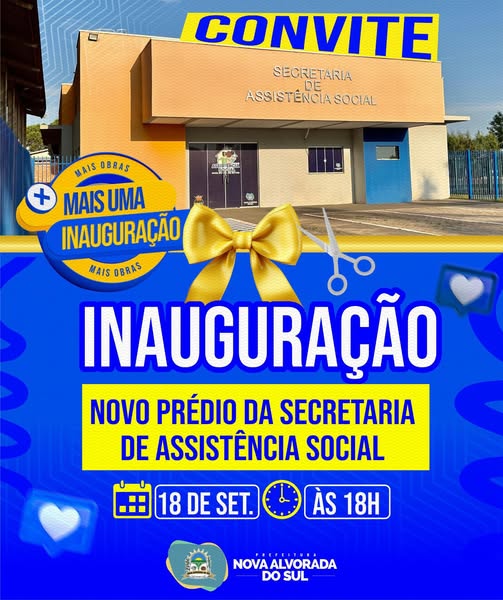 A Prefeitura Municipal de Nova Alvorada do Sul convida toda a população para a inauguração do novo prédio da Secretaria de Assistência Social.